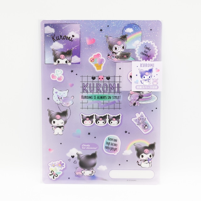 お勉強の時間も自分らしく!クロミちゃんの魅力がたっぷり詰まったB5サイズの下敷きです。 パープルを基調とした夜空のようなグラデーションに、パソコンを使いこなすクロミちゃんや、お空を眺める姿が描かれた、ちょっぴりクールで可愛いデザイン。 表面にはオーロラのようなキラキラ加工が施されており、手元を華やかに彩ります✨