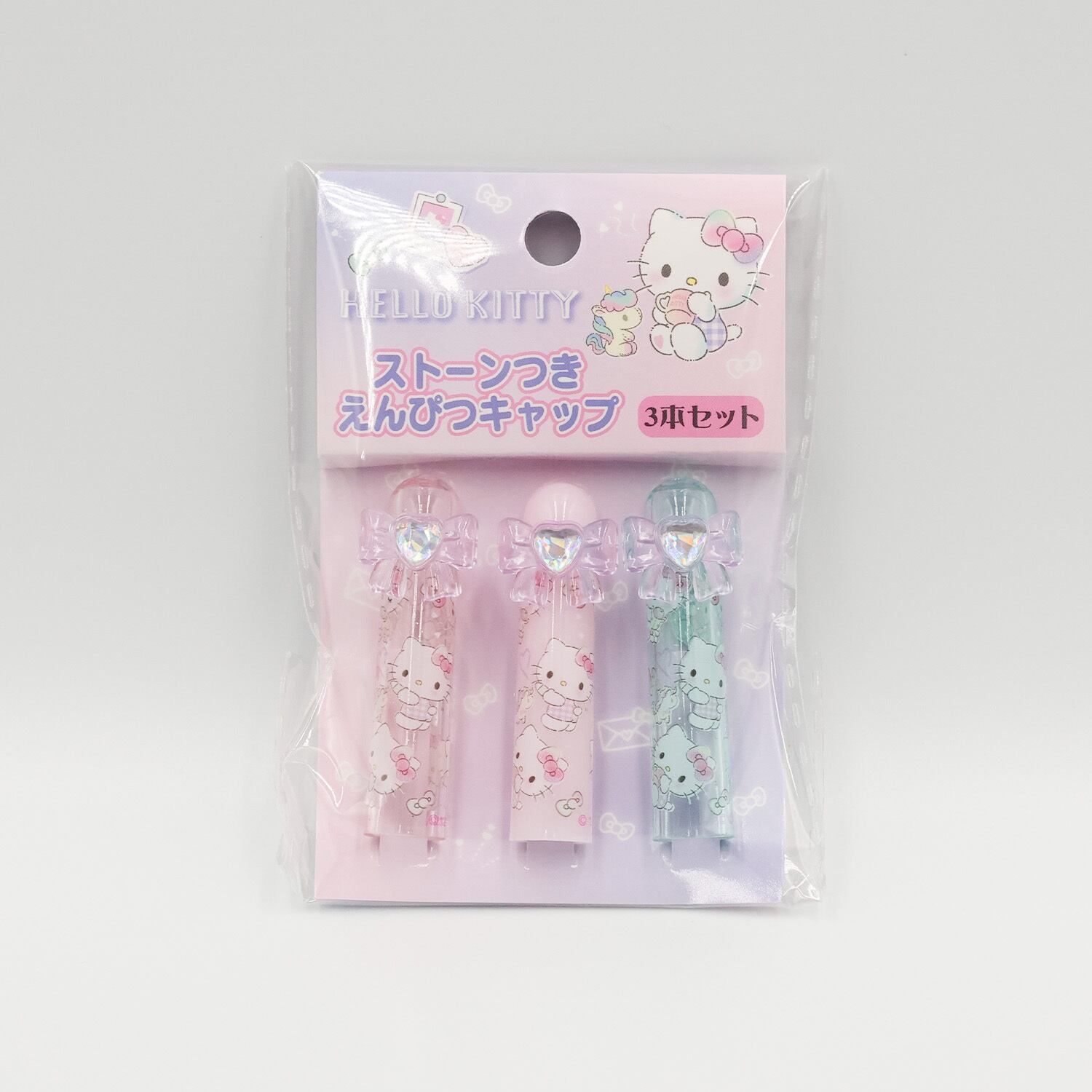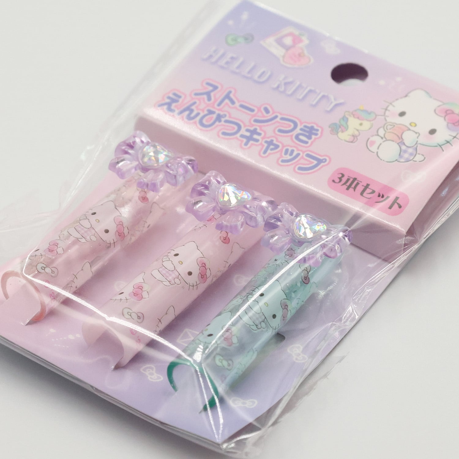 ペンケースの中がパッと華やかになる、ハローキティの豪華なえんぴつキャップ3本セットです。